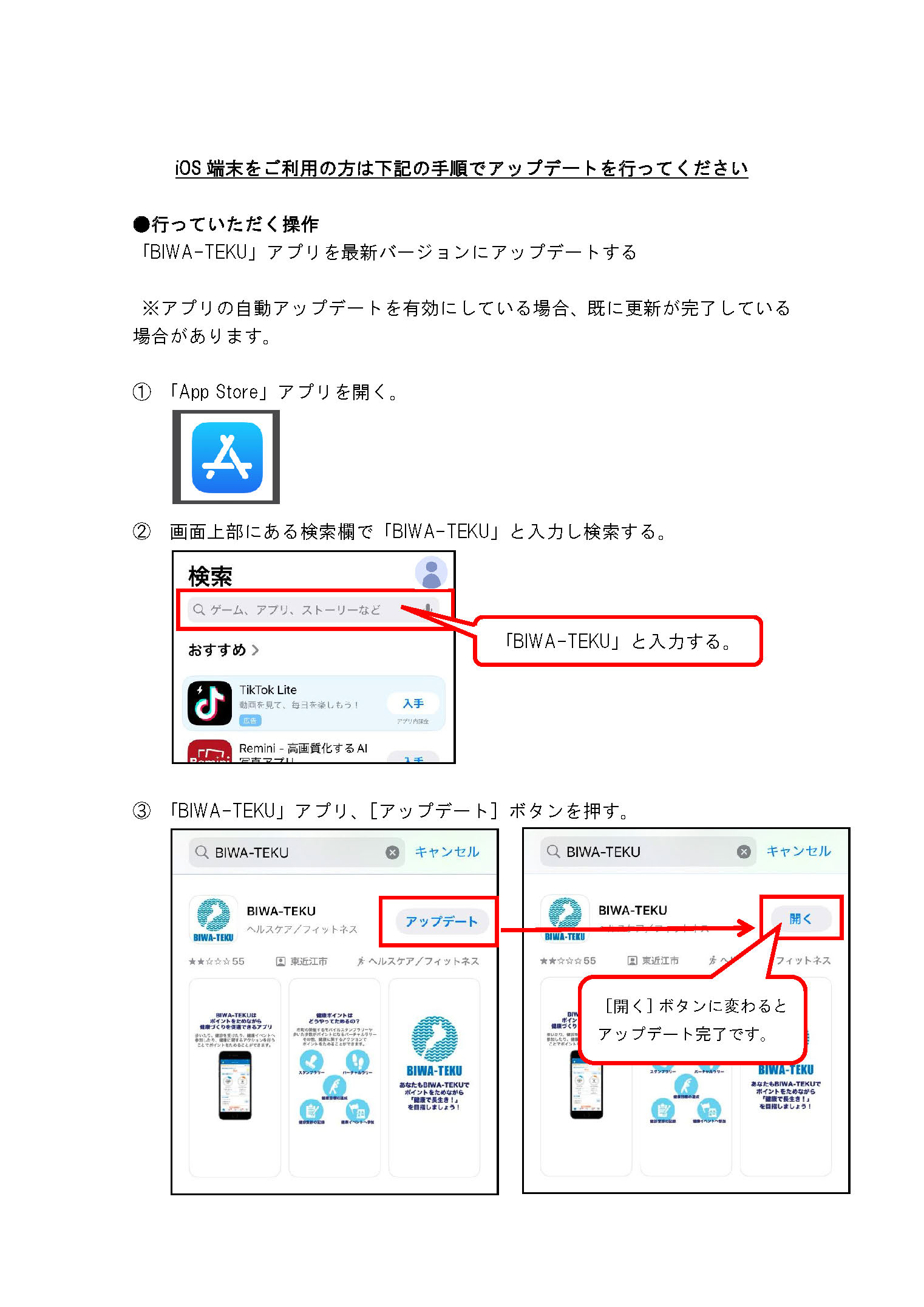 つきましてはBIWA-TEKUアプリを最新OSへ対応した調整を行いましたため、最新バージョンにアップデートの上、引き続きご利用ください。